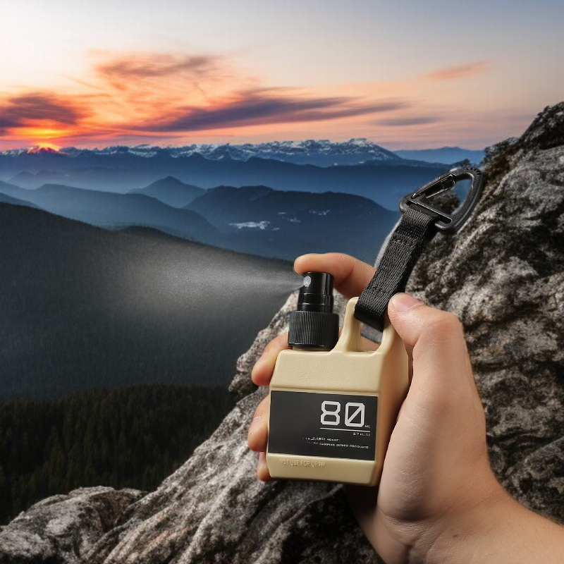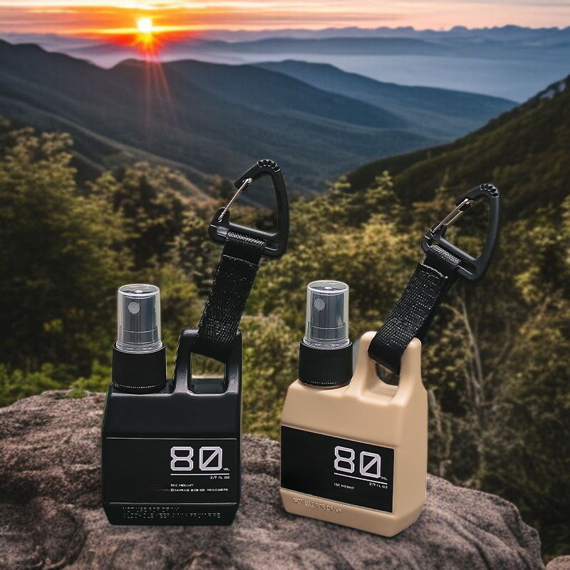 아웃도어 여행에 적합한 휴대용 플라스틱 소독제 스프레이 병. 알코올 사용 가능, 압착식 디자인으로 간편 분사, 소분 보관에 용이.